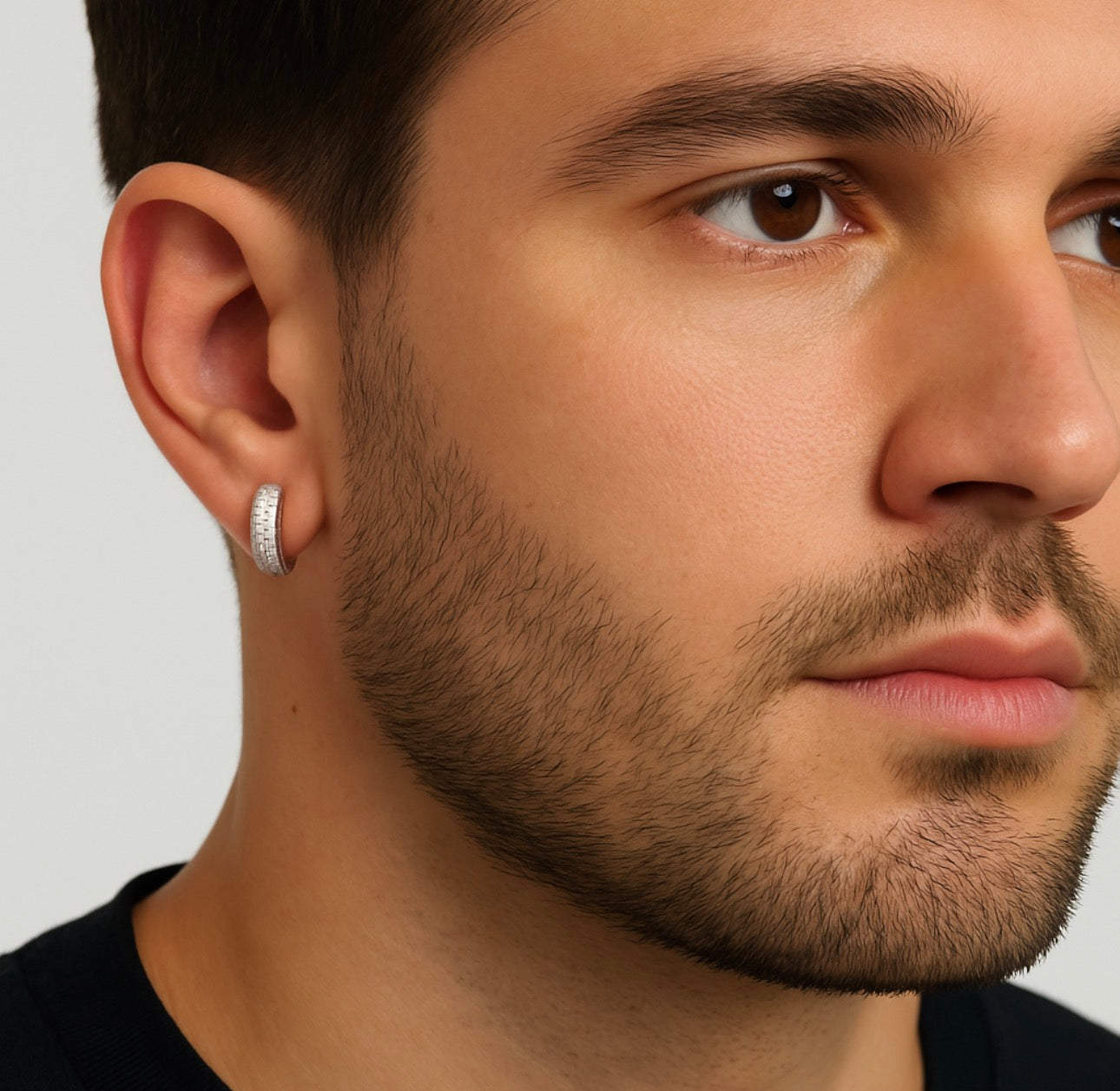 Eleganti orecchini a cerchio in lega argentata con chiusura a scatto, impreziositi da tre file di zirconi incastonati a pavé che donano luce e brillantezza ad ogni look.